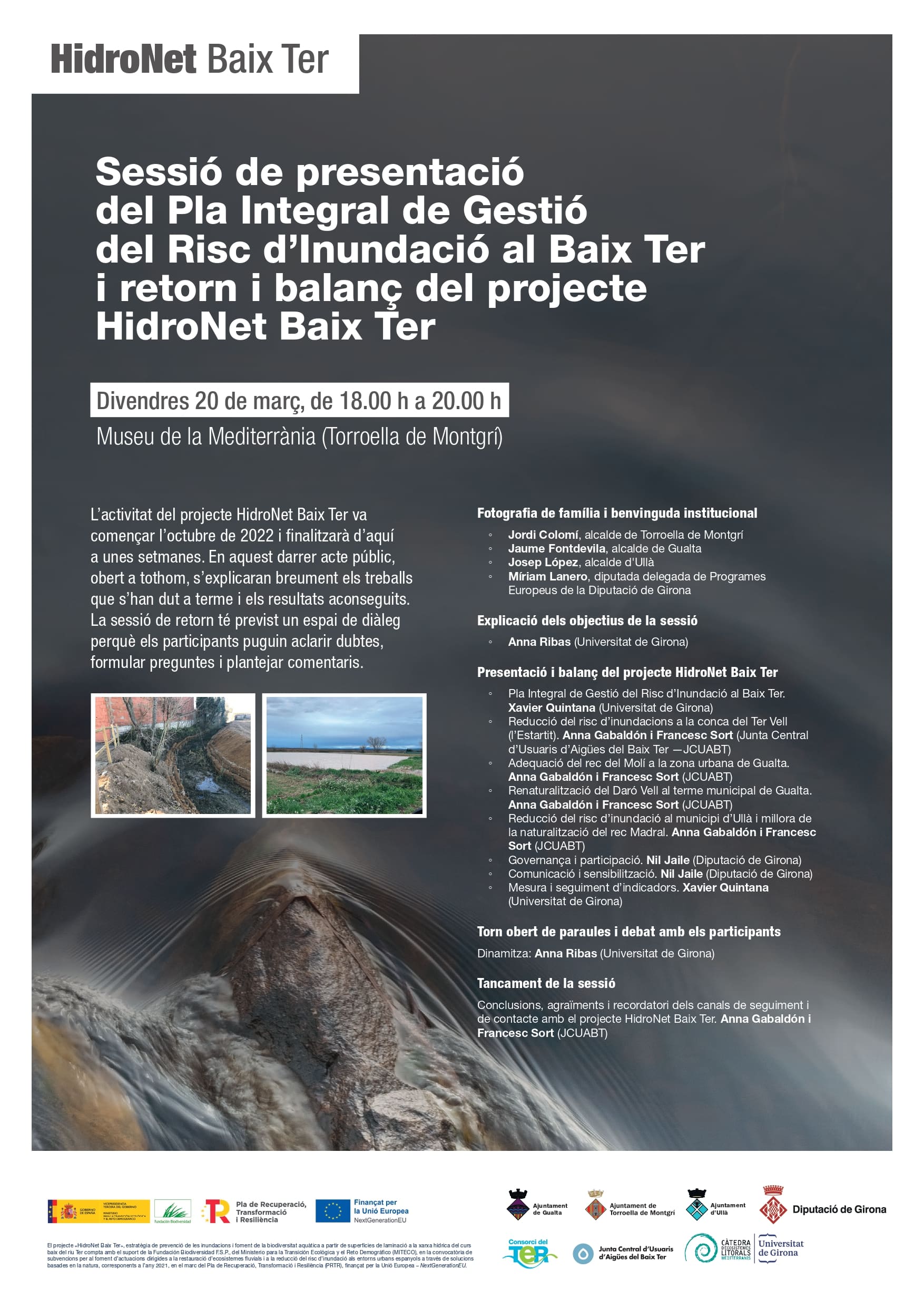 Vine a la sessió de presentació del Pla Integral de Gestió del Risc d’Inundació al Baix Ter i retorn i balanç del projecte HidroNet Baix Ter. Divendres 20 de març de 18.00 h a 20.00 h Museu de la Mediterrània (Torroella de Montgrí) Document informatiu en format PDF