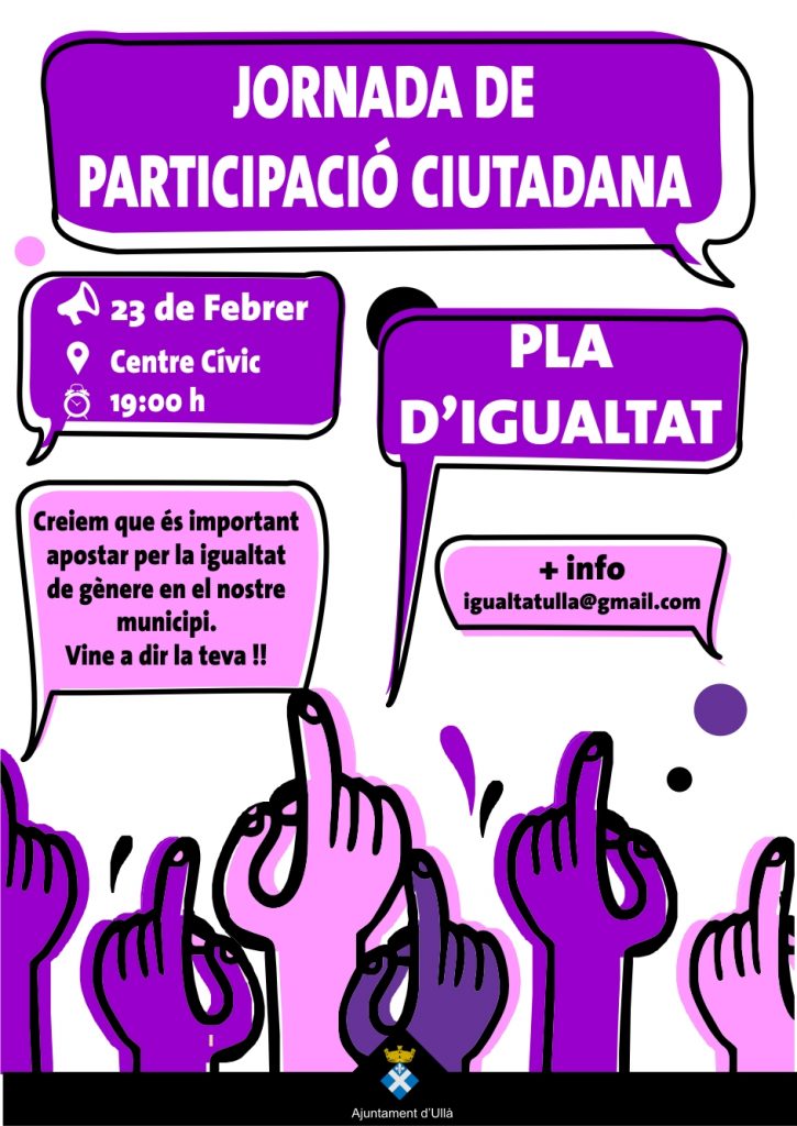 El pròxim dia 23 de febrer a les 19h al centre cívic es durà a terme una jornada de participació ciutadana per redactar el pla local d’igualtat.